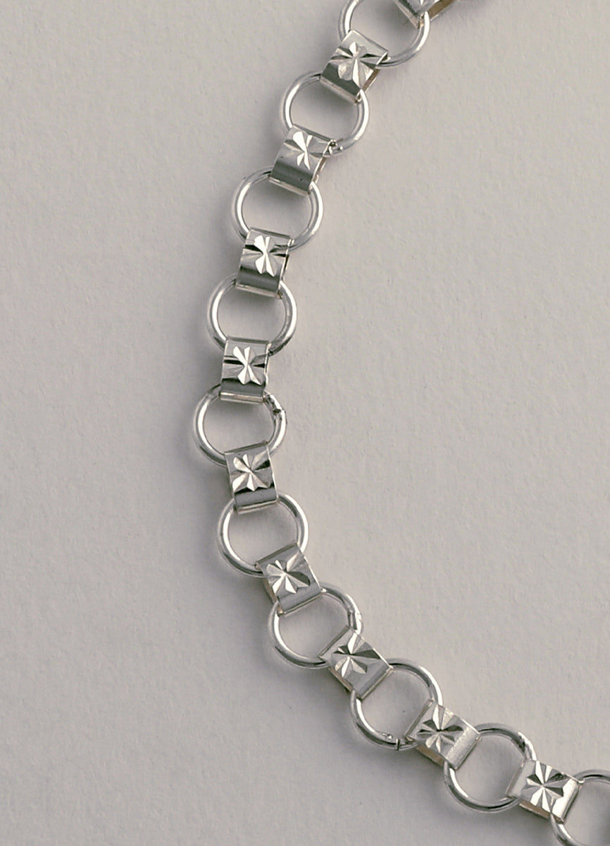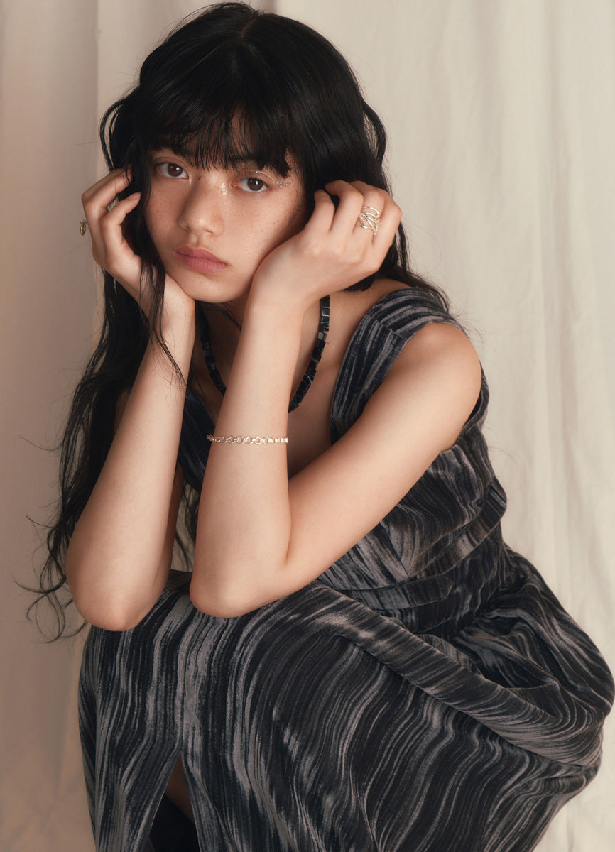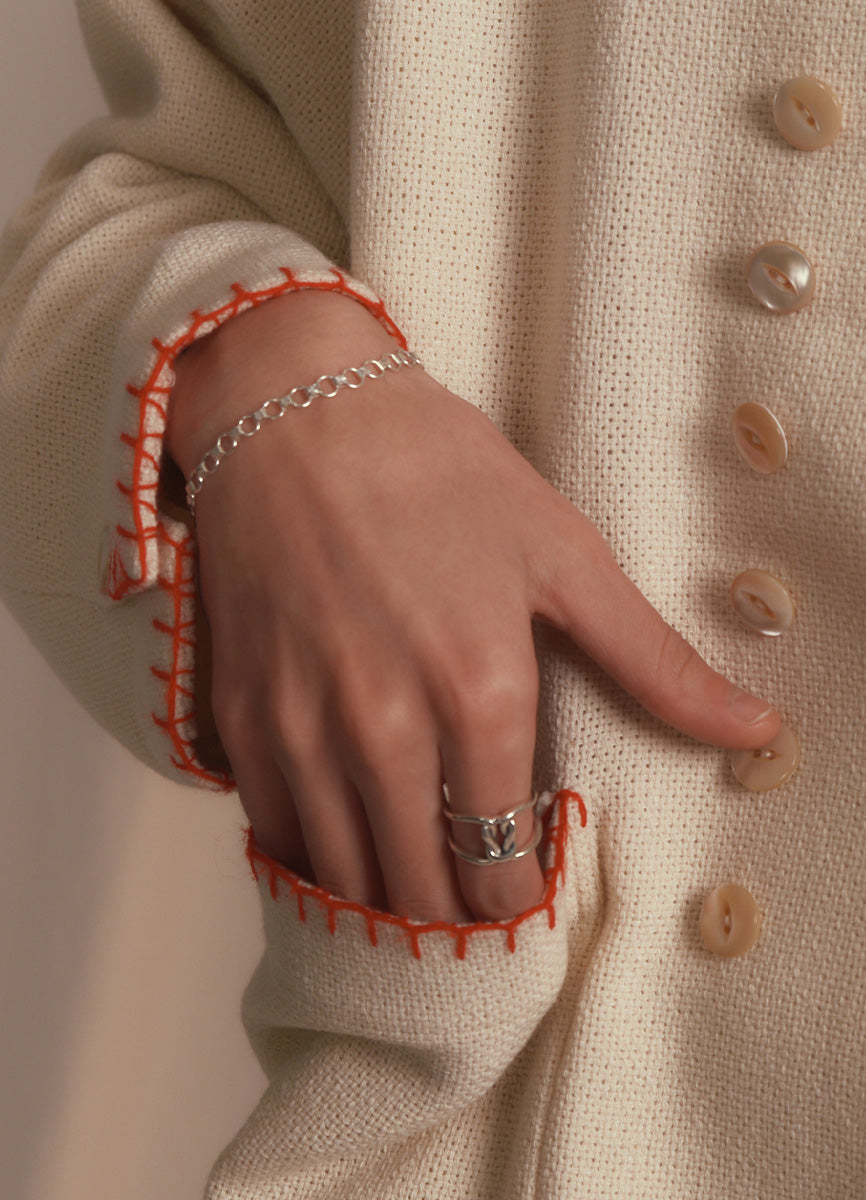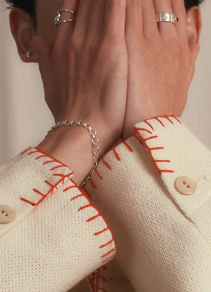 プレートを繋ぐリングがリズミカルに並び、上品さと程よい存在感を兼ね備えたデザインです。