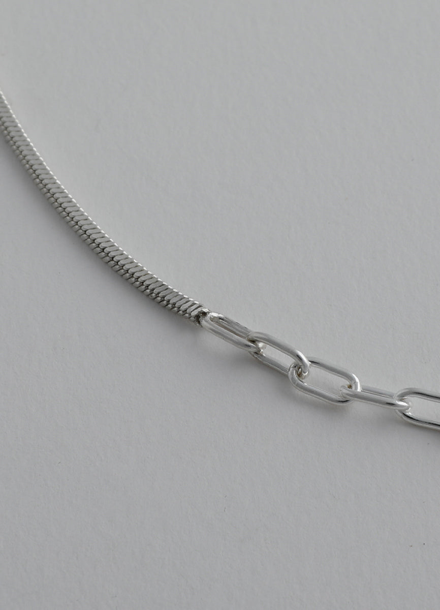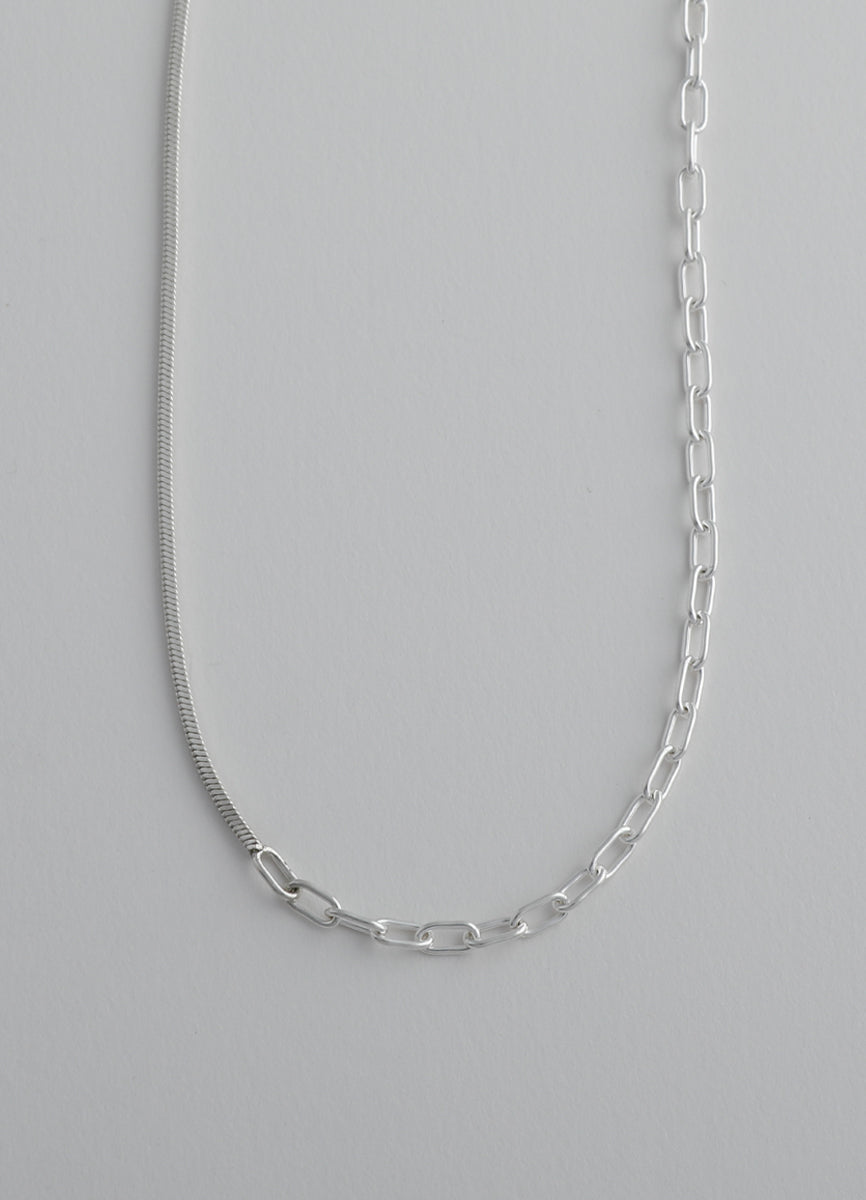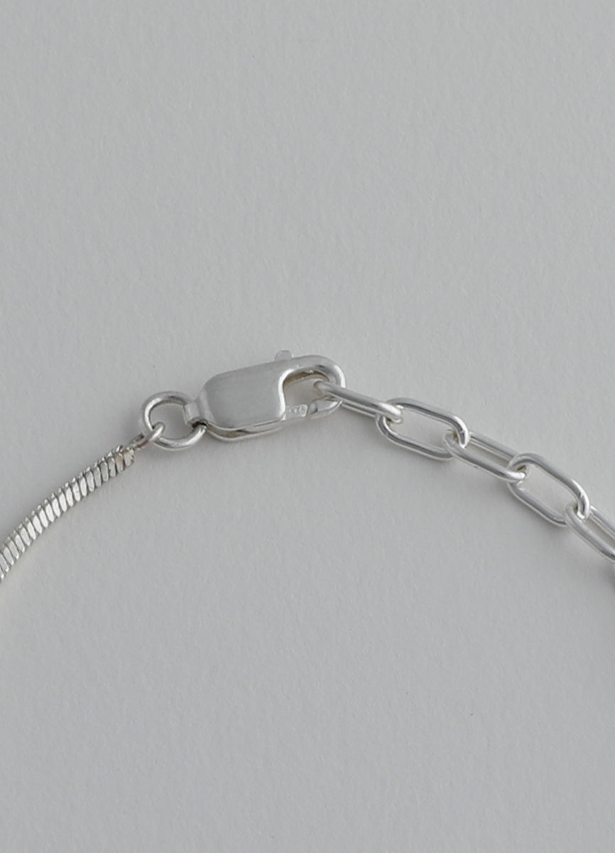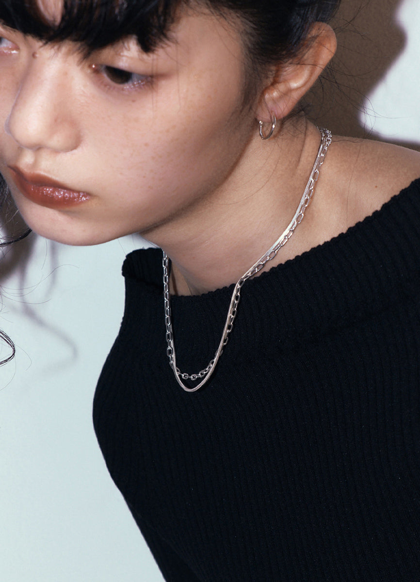 人気のスタイリッシュな印象のスクエア型スネークチェーンと抜け感のあるチェーンを組み合わせ、上品さと存在感を両立。