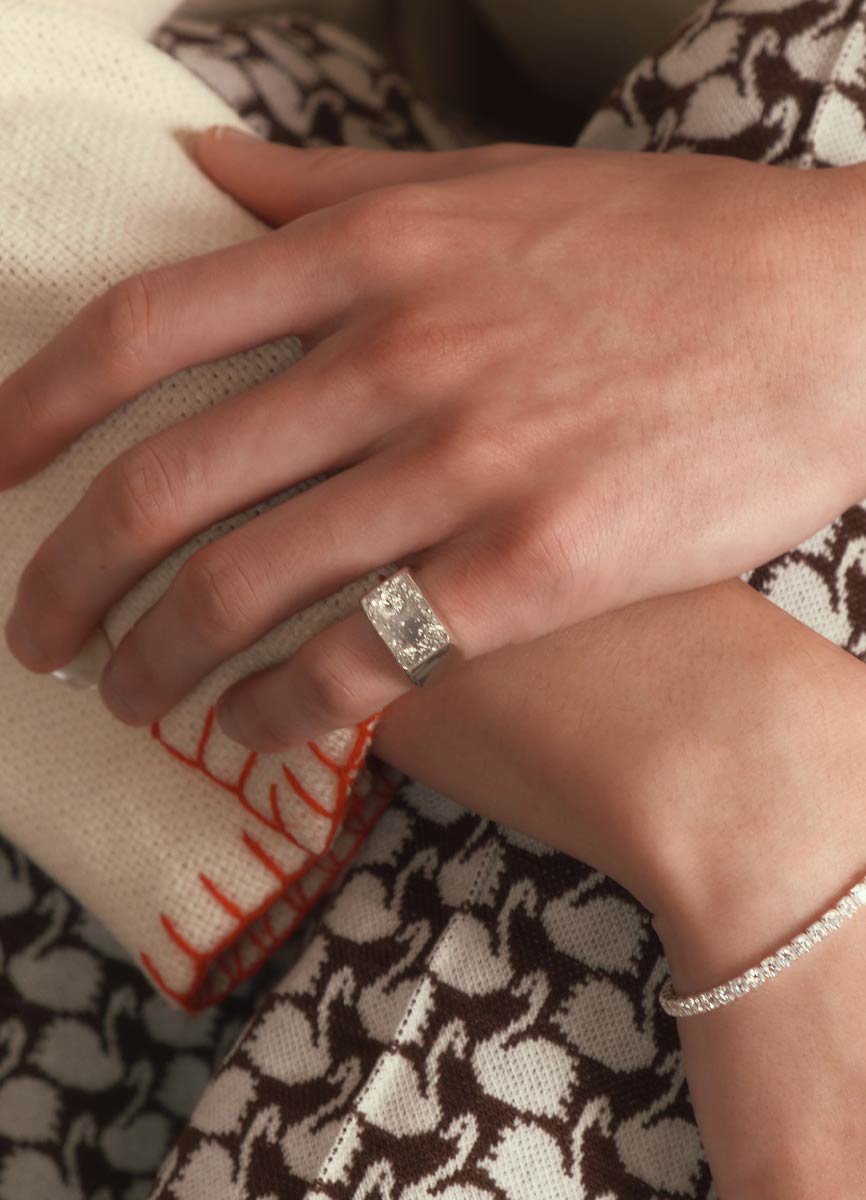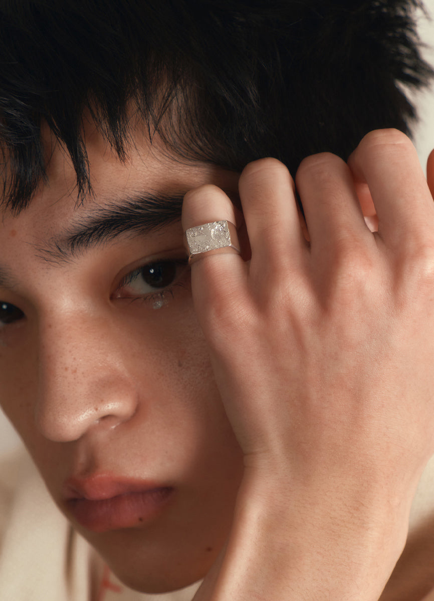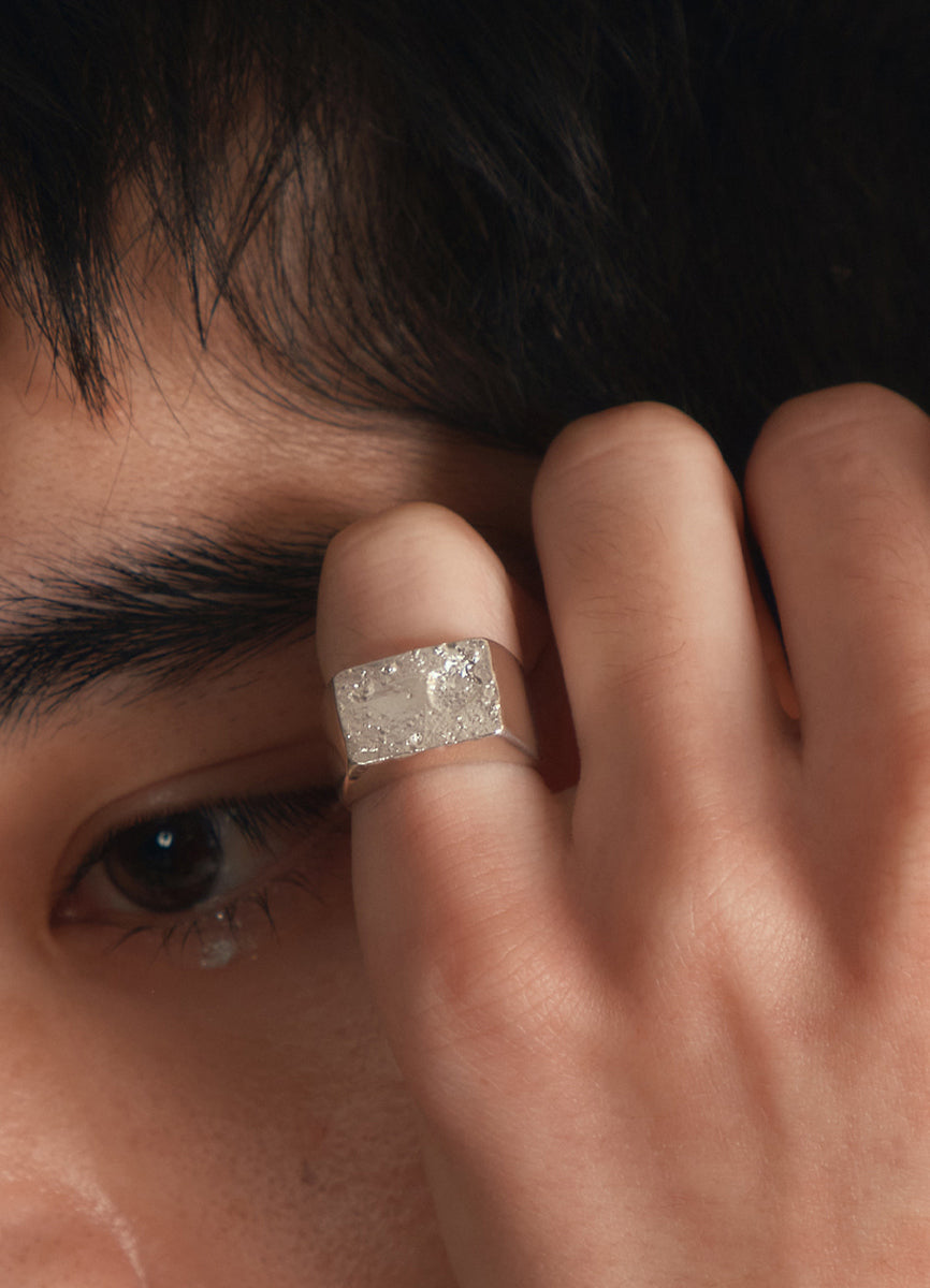 石やコンクリートの割れ目を思わせる断面デザインと、なめらかな指回りのコントラストが楽しめるシグネットリング