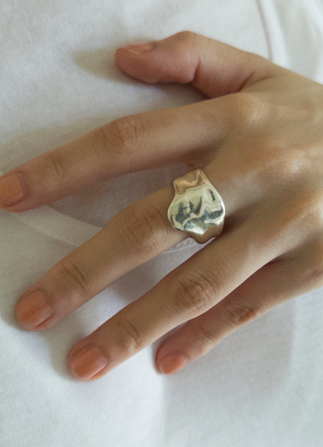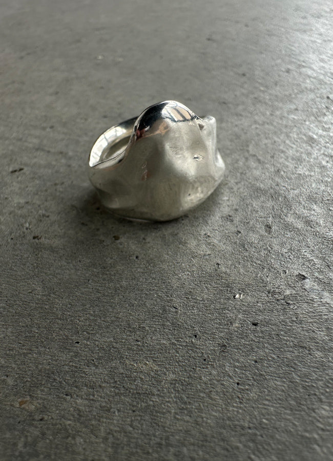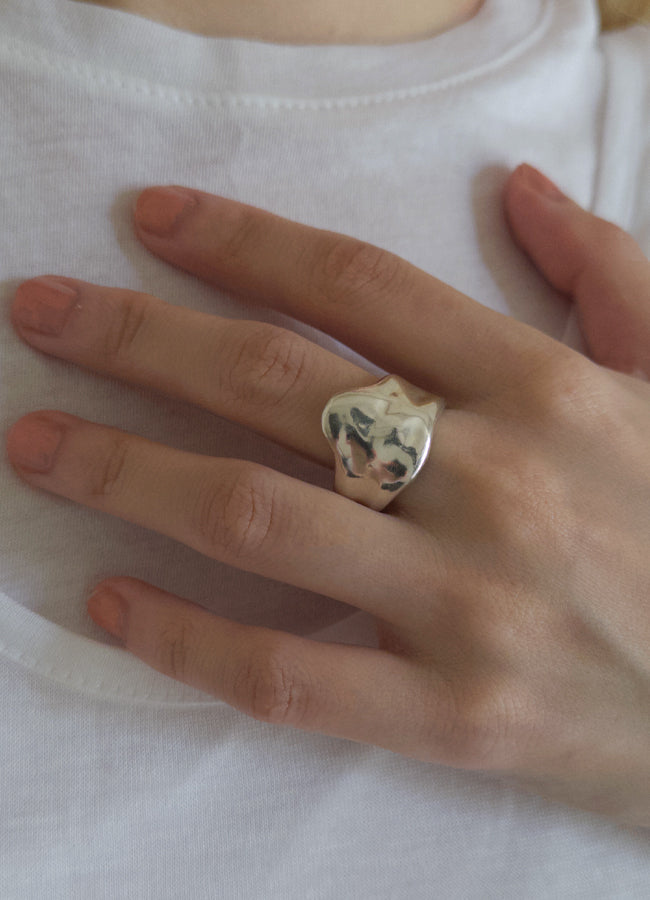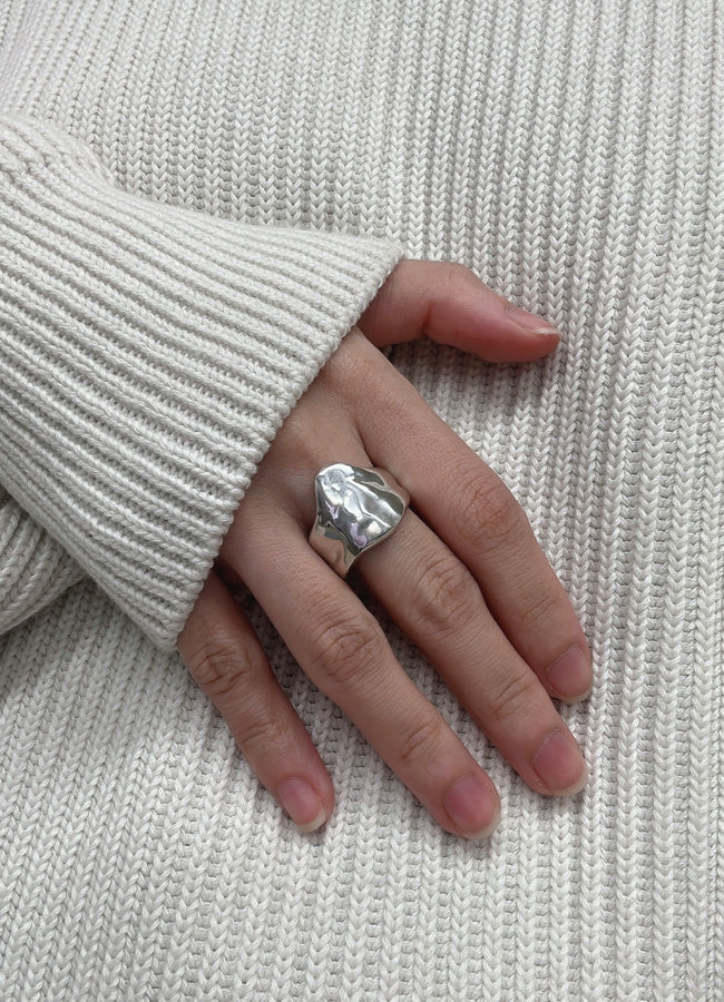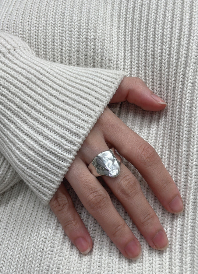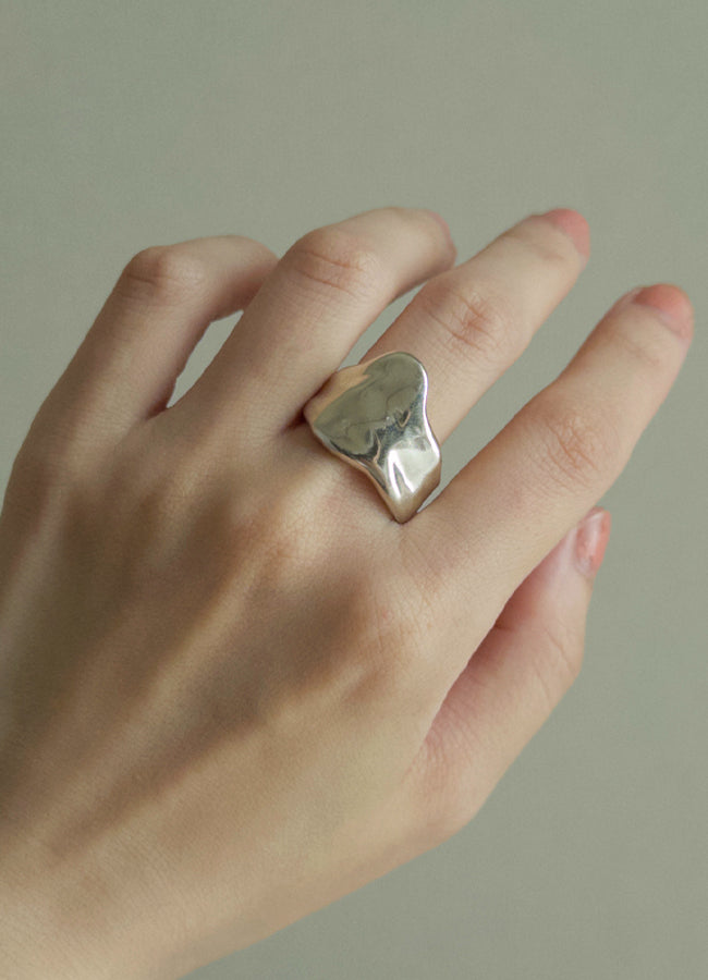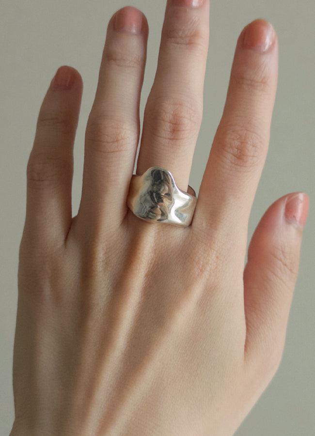 溶けて、指をつたうように覆うデザイン。幅があり、ボリュームがある為、通常よりサイズupした号数をおすすめ。