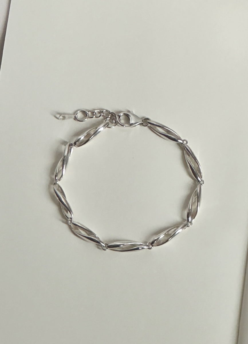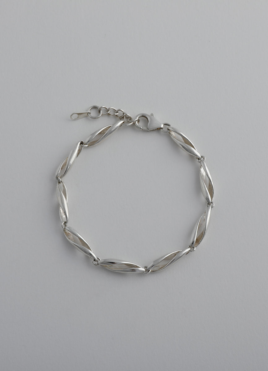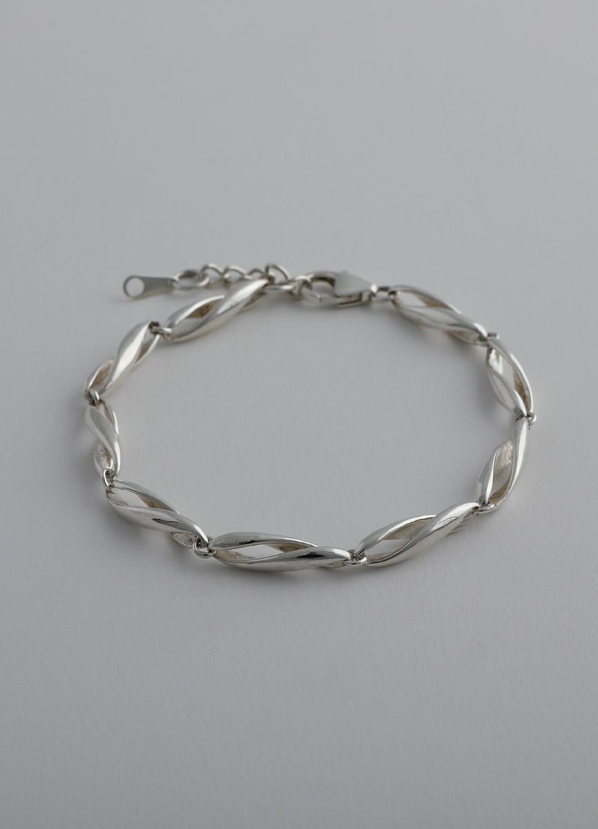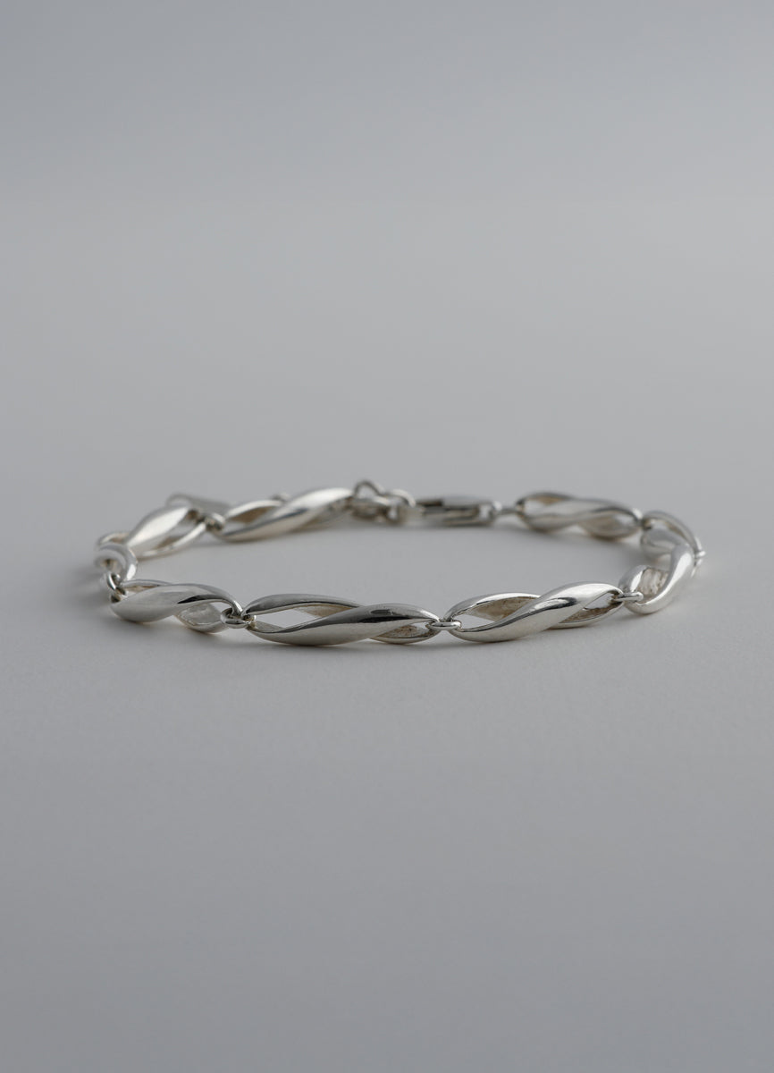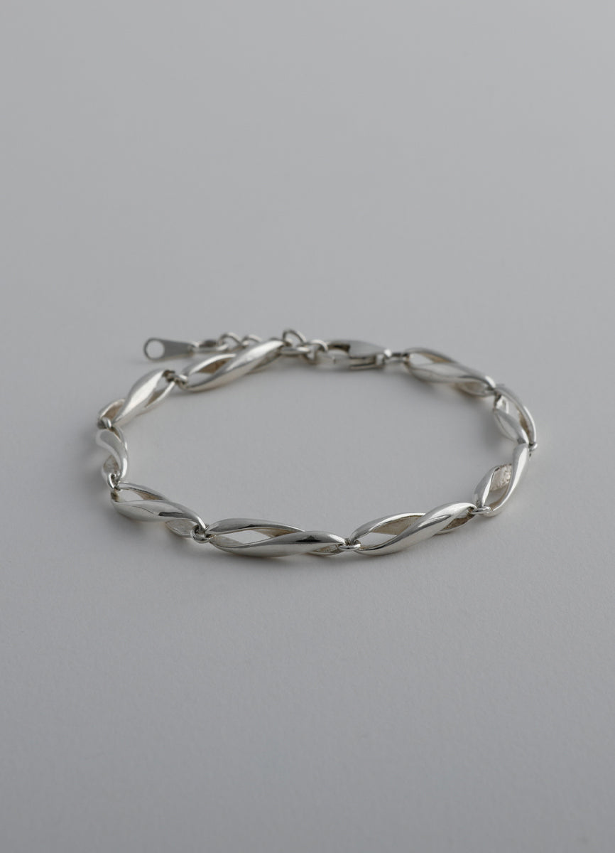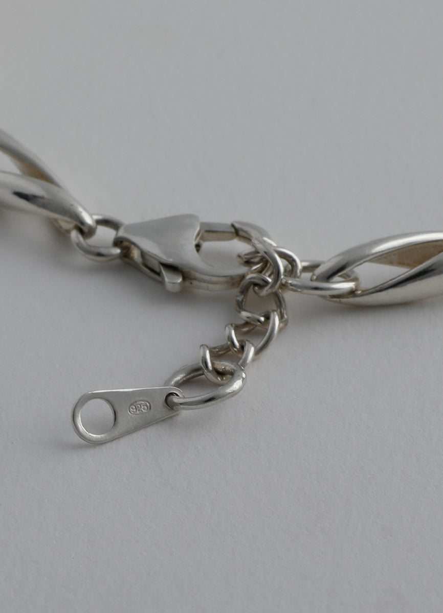 空間をあけて柔らかくひねりを加えたパーツを繋げ、さり気ない立体的さと抜け感を併せ持つチェーンブレスレット。