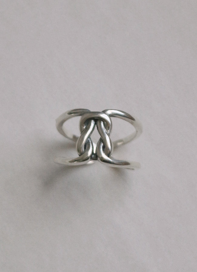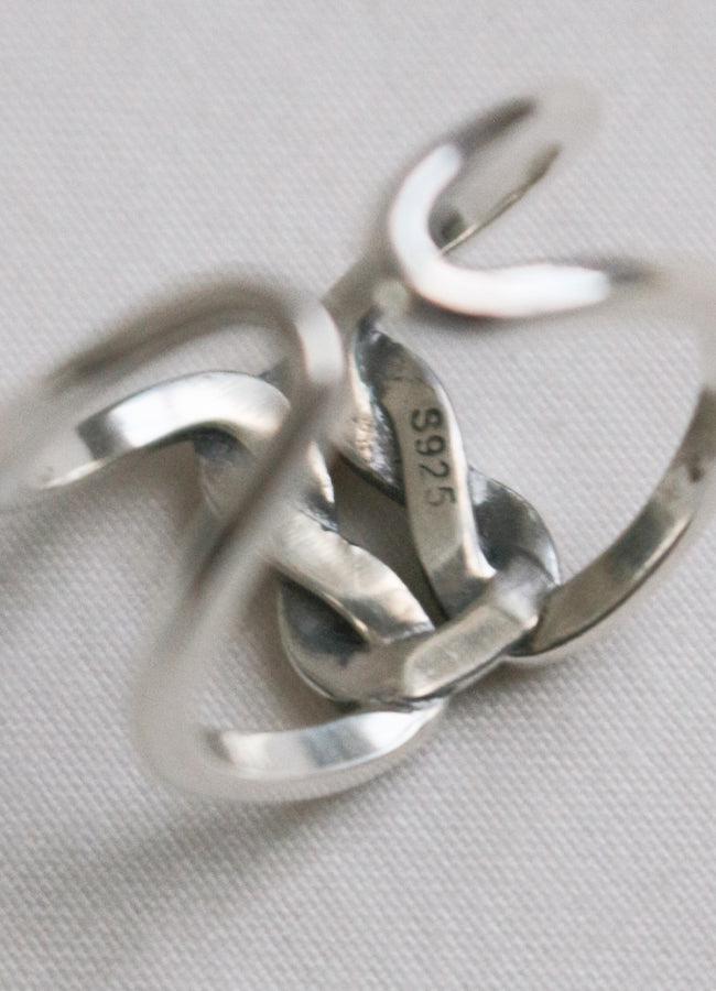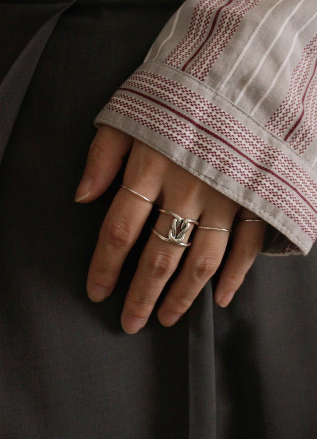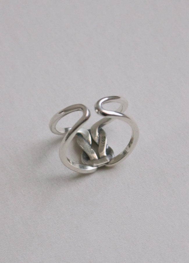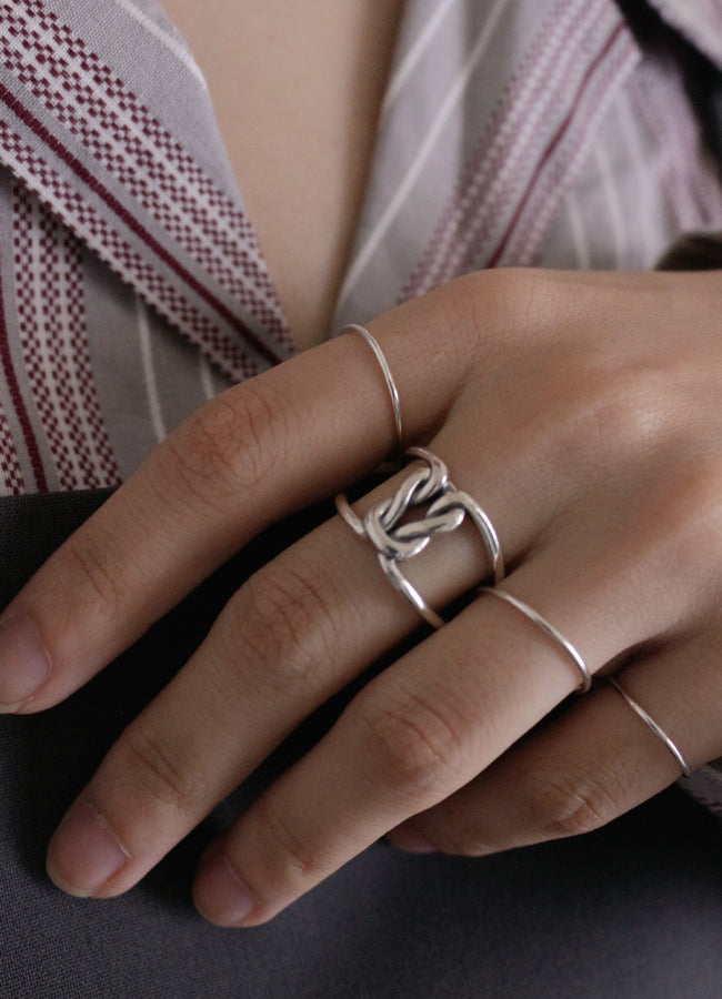 糸が編み込まれたような表面に燻し加工を施し、落ち着いたダークさとsilver925ならではのつや感の対比をお楽しみいただけるデザイン。